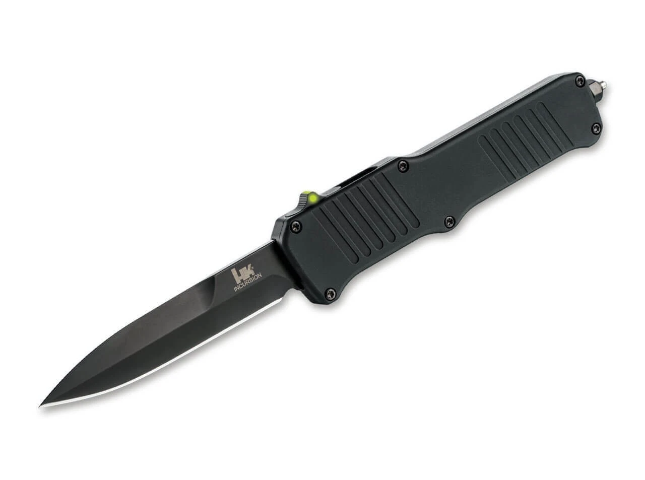 Das Heckler & Koch Incursion ist ein schlankes und extrem schnelles OTF, dass von Hogue gefertigt wird. Es verfügt über eine beschichtete Spearpoint-Klinge aus 154CM, die sich automatisch aus dem Griff schiebt. Der Auslöser ist mit einem selbstleuchtenden Tritium-Marker versehen, der die bequeme Bedienung des Messers sogar bei völliger Dunkelheit sicherstellt. Diese hochpräzise Mechanik zeichnet sich durch Belastbarkeit und Zuverlässigkeit aus. Das strukturierte schwarze Aluminiumgehäuse mit gefrästen Rillen liegt sicher in der Hand. Mit Clip (Tip-Down/r), Glasbrecher und Nylonetui.