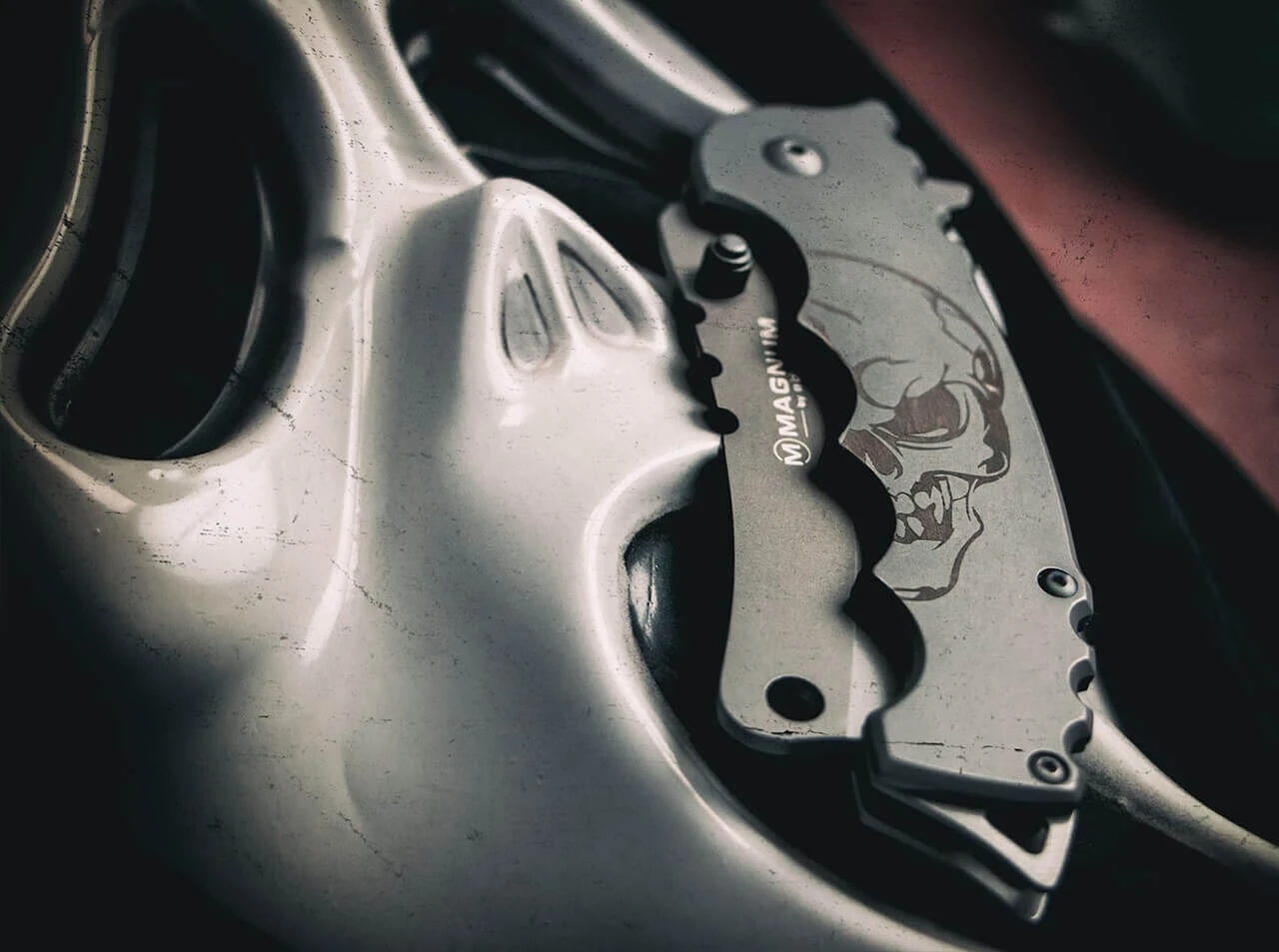 Die außergewöhnliche Klinge des Magnum Mortem wird aus 440A gefertigt und mittels des Flippers oder des beidseitigen Daumenpins geöffnet. Während die hintere Schale den Framelock trägt, ist die Vorderschale des Edelstahlgriffs mit einem stilisiertem Totenkopf versehen. Die ausgeprägten Riffelungen im Bereich der Daumenauflage garantieren zudem kontrolliertes Schneiden. Mit Clip (Tip-Down) und Fangriemenöse.