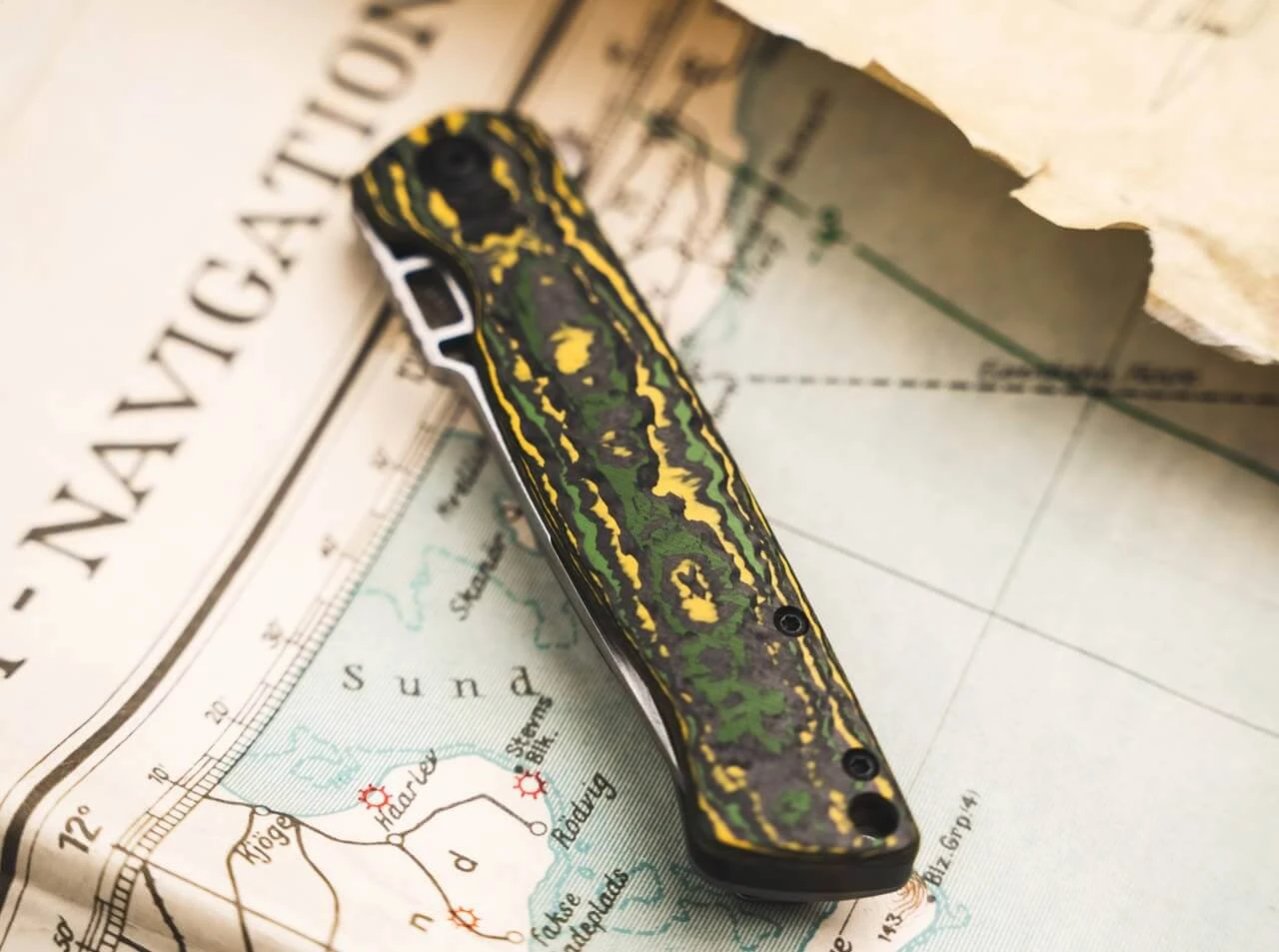 Das Böker Plus ME 109 Damast greift zahlreiche Designelement der legendären Messerschmitt auf. Der Durchbruch am Rücken der Klingenbasis hat unübersehbar die Form der Pilotenkanzel und ist im geschlossenen und geöffneten Zustand des Messers sichtbar. Die Falzen im Blech der Motorhaube als Aussparung für die Laufseelenachsen der beiden MG 17 bilden die Vorlage für den Schor an der Klingenspitze. Der Flipper deutet ein Rad des versenkbaren Fahrwerks an. Für die vordere Kohlefaserschale wurde das Material Toxic Storm des Herstellers Fatcarbon Materials in den Farben Grün, Schwarz und Gelb gewählt. Die Farbgebung orientiert sich damit am charakteristischen Tarnanstrich der Bf 109 mit grüngrauem Grundstrich und abgesetzt gestrichenem vorderem Rumpfwerk in Gelb. Die Gegenseite bildet ein Framelock aus Titan mit aufwändig integrierter Hartmetallkontaktfläche. Ein formschön und aufwändig integrierter Clip ermöglicht die Trageweise Tip-Up rechts. Auslieferung mit hochwertigem Etui zur Aufbewahrung und Echtheitszertifikat.