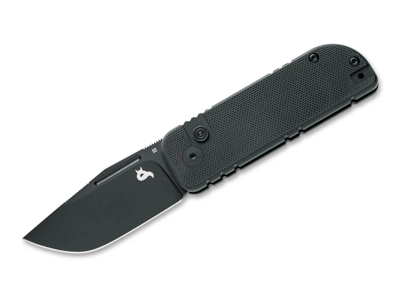 Das BlackFox Nu-Bowie von Kean Alfaro definiert das Bowie Messer auf seine ganz eigene Weise. Die Klinge deutet mit ihrer leicht geschwungenen Form diskret auf die Namensherkunft hin, hält sich aber in Sachen Performance alles andere als bedeckt. Das komplett schwarze EDC Messer öffnet die D2 Klinge per Nagelhau und wird durch den Button Lock wieder entriegelt. Die texturierten Griffschalen aus G10 liegen angenehm in der Hand und erhalten durch die Jimpings am Klingenrücken zusätzliche Grifffläche. Mit umsetzbarem Tip-Up Clip.