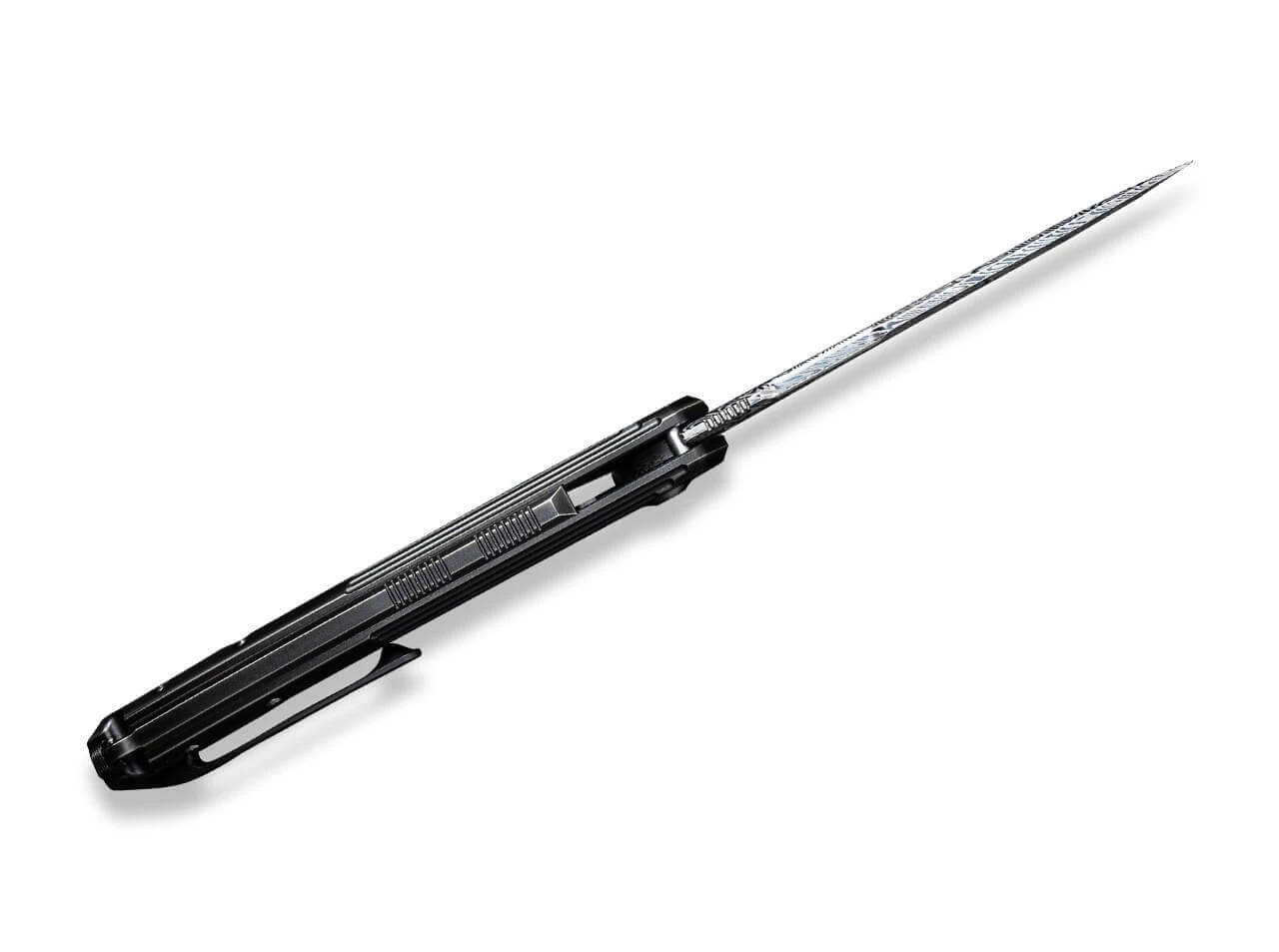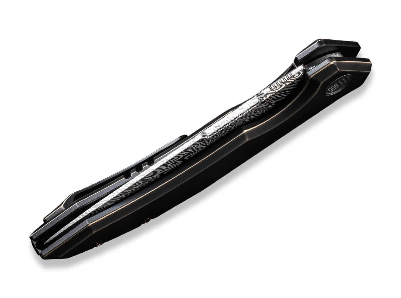 Das WE Knife Quixotic ist der Idealist unter den EDC Messern. Als Beweis führt der Framelock Folder die mythische Heimskringla Damast-Klinge sowie den bronze mellierten Griff aus schwarzen Titan an, mit denen die alltäglichen Schneidarbeiten ein Leichtes werden. Die markante Fehlschärfe sowie die Riffelungen auf dem Klingenrücken setzen optische Akzente, während der Clip (Tip-up/r) sowie die Fangriemenöse das Messer funktionell abrunden.