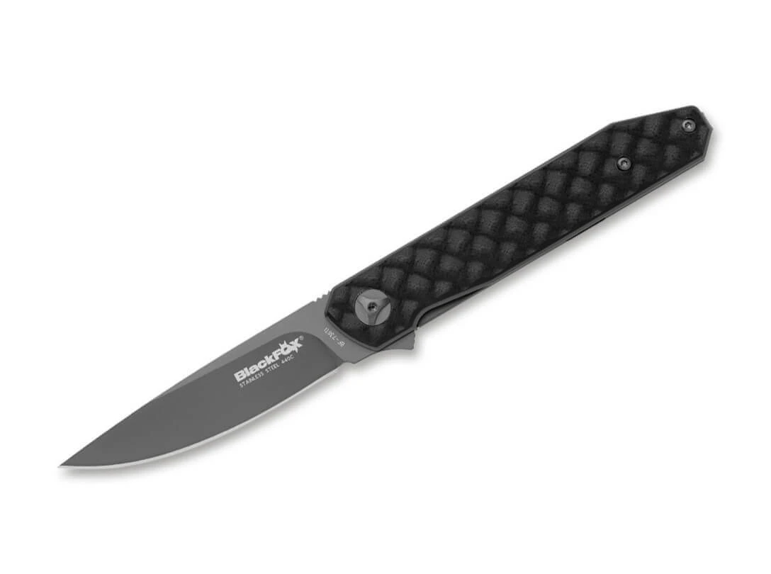 Das BlackFox Reloaded begeistert durch schlichte und elegante Linienführung. Die schlanke rückenspitze Klinge mit grauer Titanaluminiumnitrid-Beschichtung wird aus 440C gefertigt, öffnet mittels Flipper und verriegelt per Linerlock. Die G10-Griffschalen auf Edelstahlplatinen sind mit einer aufwendig gefrästen Rautenstruktur versehen. Mit Clip (Tip-up/r).