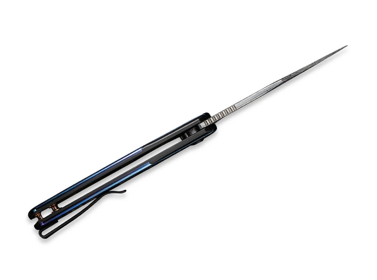 Das WE Knife Snick hat so einiges auf dem Kerbholz. Damit sind nicht nur die Einkerbungen an Klingenrücken und Griff für die sichere Handhabe gemeint, sondern vor allem die vortreffliche Materialwahl aus pulvermetallurgischem CPM-20CV für die Klinge und ein Mix aus schwarzem Titan mit schillerndem Timascus (Titan–Damast) für den Griff. Die Flipper Öffnung und der robuste Linerlock schlagen in die gleiche Kerbe und runden die Alltagstauglichkeit des edlen Folders ab. Mit Titan–Clip (Tip-up/r).